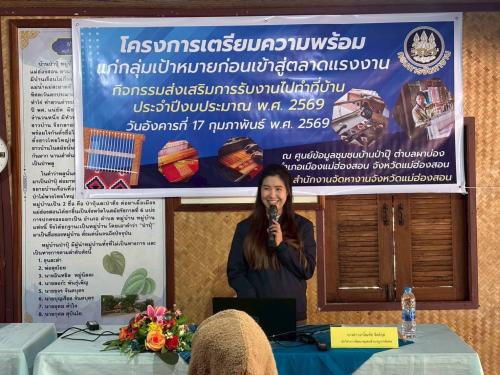สำนักงานพัฒนาชุมชนจังหวัดแม่ฮ่องสอน ร่วมเป็นวิทยากรในโครงการเตรียมความพร้อมแก่กลุ่มเป้าหมายก่อนเข้าสู่ตลาดแรงงาน กิจกรรมหลักส่งเสริมการประกอบอาชีพ กิจกรรมย่อยส่งเสริมการรับงานไปทำที่บ้าน ประจำปีงบประมาณ พ.ศ. 2569 ณ ศูนย์ข้อมูลชุมชนบ้านป่าปุ๊ ตำบลผาบ่อง อำเภอเมืองแม่ฮ่องสอน จังหวัดแม่ฮ่องสอน